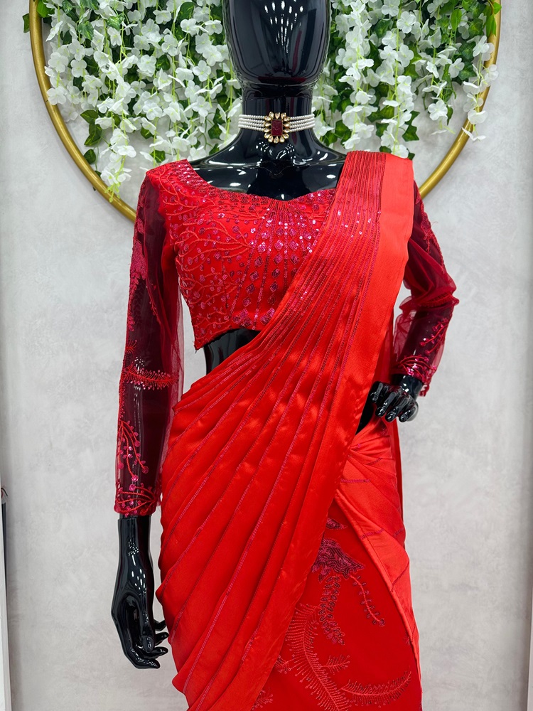 Introducing the designer party-wear lehenga saree which is crafted to radiate elegance and grace. The rich red color symbolizes passion, energy, and celebration, making it perfect for festive and special occasions.