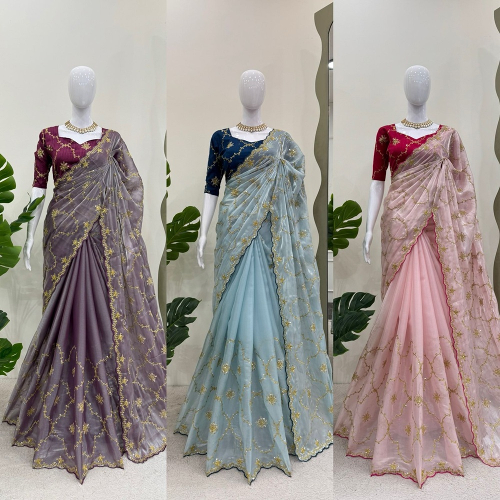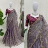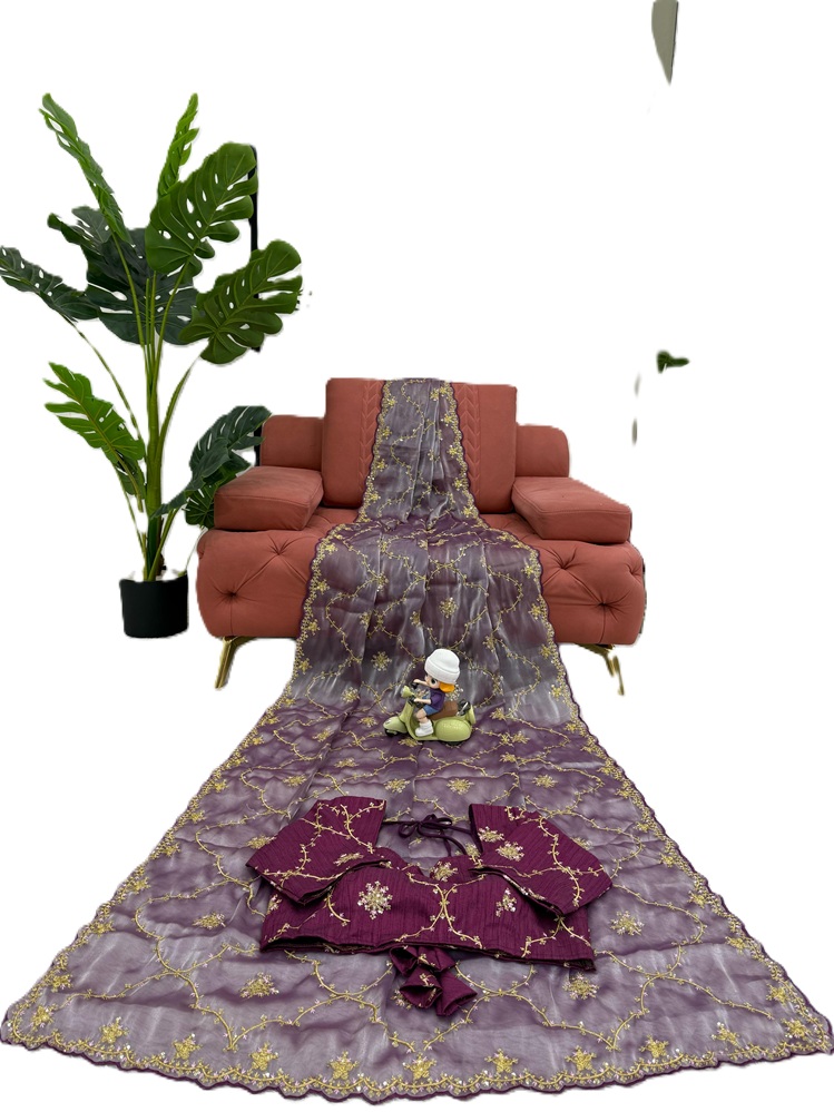 The accompanying blouse is equally stunning, crafted from the same high-quality Jimmy Choo fabric and embellished with matching thread and sequin work. The design of the blouse can range from a classic, simple cut to a more contemporary, embellished style, perfectly complementing the saree.