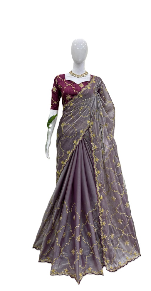 Imagine draping yourself in sheer elegance with this breathtaking designer saree. Crafted entirely from luxurious Jimmy Choo fabric, the saree boasts a rich hue that catches the light with every movement. The body of the saree is adorned with intricate threadwork, forming delicate floral or geometric patterns that add a touch of traditional artistry. Scattered across this exquisite embroidery are shimmering sequins, meticulously hand-stitched to create a dazzling interplay of light and texture.