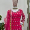 This exquisite Kurti Sharara set, crafted from premium faux georgette fabric, redefines elegance and charm. Both the Kurti and Sharara feature intricate thread embroidery adorned with shimmering sequins, adding a touch of glamour.