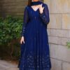 Completing the set is a matching faux georgette dupatta, echoing the delicate beauty of the kurta. It is also embellished with the same intricate threadwork and 9mm sequins, creating a cohesive and harmonious look. The lightweight nature of the dupatta allows it to drape beautifully, adding a graceful finishing touch.