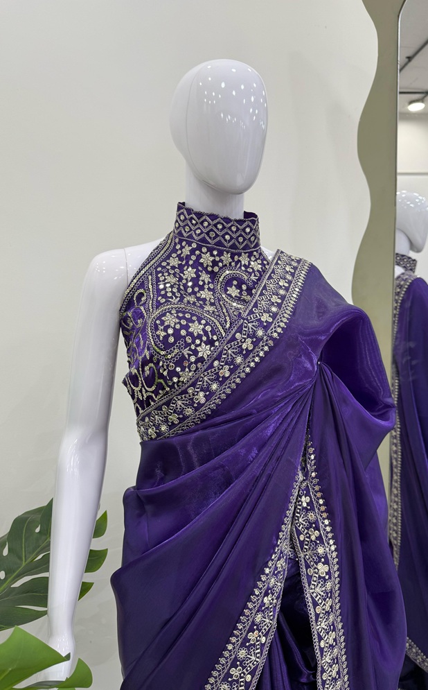 The accompanying blouse is equally stunning, crafted from the same high-quality Jimmy Choo fabric and embellished with matching thread and sequin work. The design of the blouse can range from a classic, simple cut to a more contemporary, embellished style, perfectly complementing the saree.