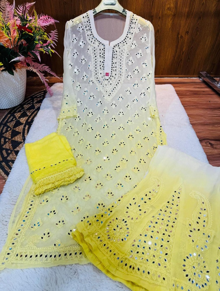 This exquisite Lucknowi Chikankari Kurti Palazzo Set features a kurti and palazzo intricately adorned with dual-sided mirror work and traditional Lucknowi Chikankari embroidery and craftsmanship. Made from lightweight, breathable chiffon fabric, the outfit includes a matching chiffon dupatta with delicate detailing that ties the ensemble together. The kurti boasts a straight cut with side slits, giving it a contemporary silhouette, while the palazzo pants offer comfort with a wide-leg fit. The shimmering mirror work on both sides enhances its charm, making it eye-catching from every angle.