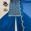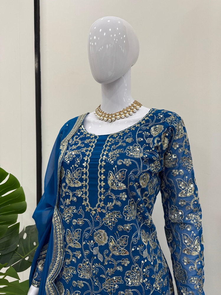 Introducing our beautifully crafted the exquisite Sarara suit to capture attention with its delicate fabric and dazzling embellishments. The highlight of the top is the intricate thread work interwoven with shimmering 9mm sequins. This combination creates a beautiful play of texture and light, adding a touch of glamour.