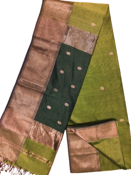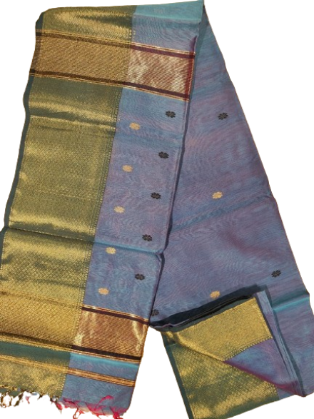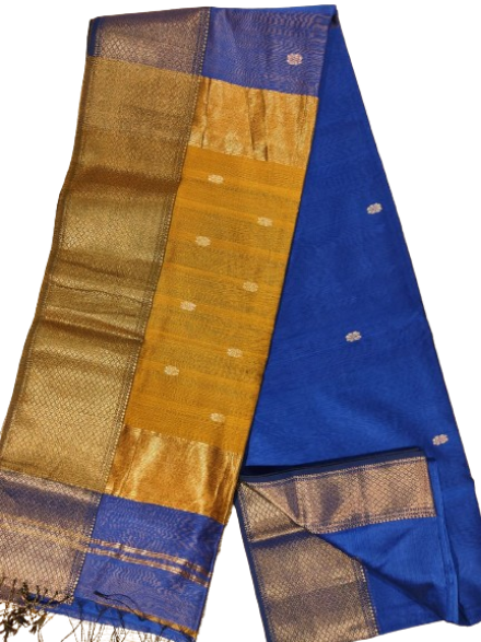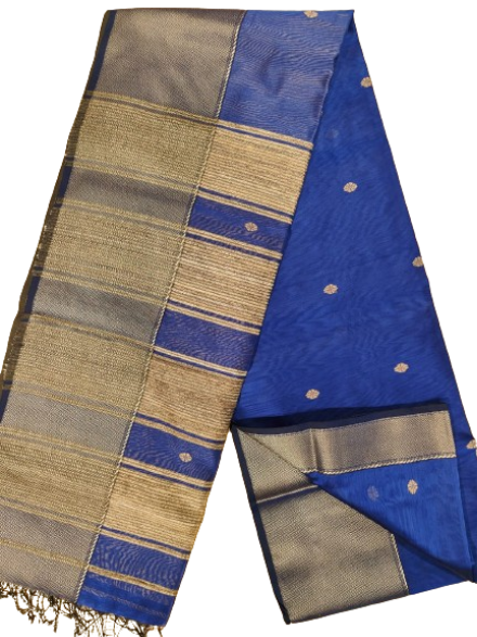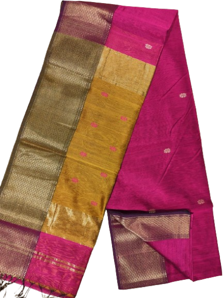 Maheshwari Cotton Silk Saree, a base line product that effortlessly blends comfort with sophistication. This saree, adorned with a resham-golden border, is a testament to the exquisite craftsmanship and rich tradition of Maheshwari handloom. Here are the details that make this saree a must-have in your collection:
