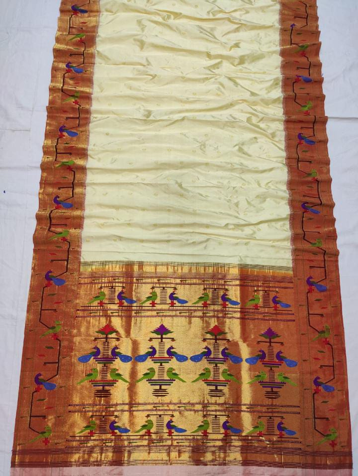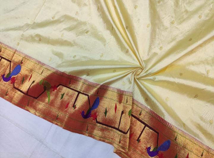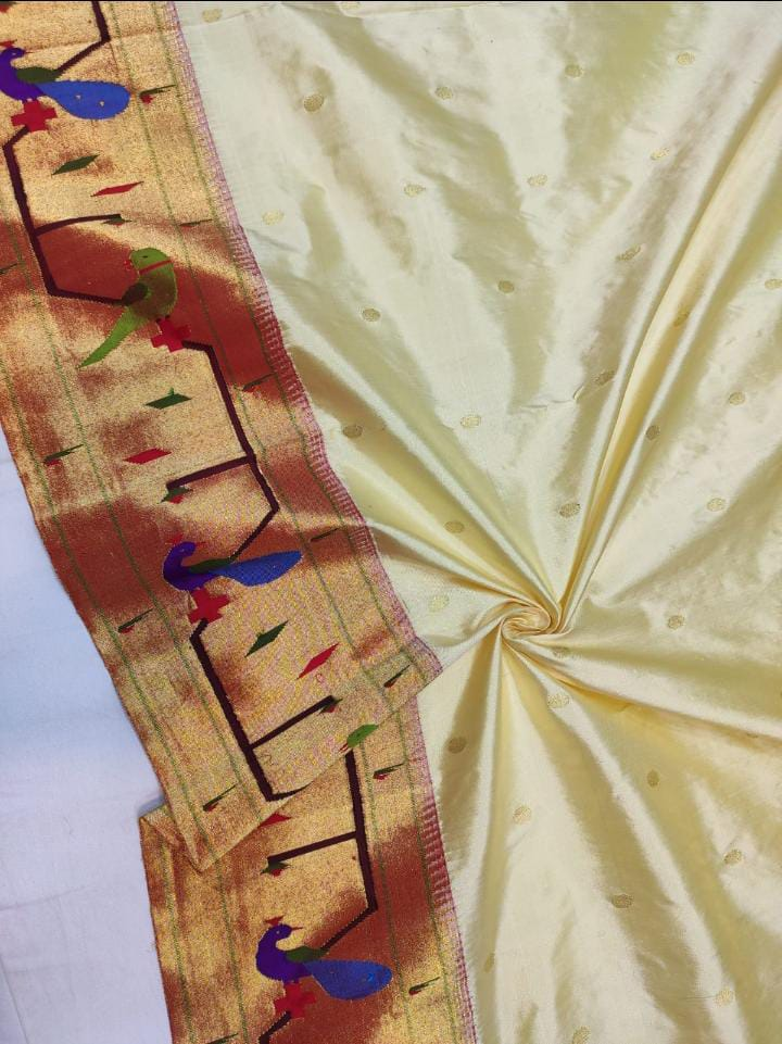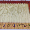 Peacock Parrot Brocade Paithani, with soothing cream hues and exquisite design come together from Yeola. The soothing Cream color saree with Golden zari in pallu and designed border is not just a garment; it’s a masterpiece that reflects the signature artistry of Yeola Paithani, evolving through centuries.