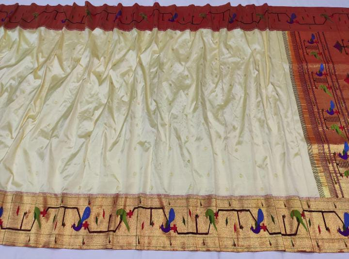 - Soothing Color Palette: Immerse yourself in a burst of vibrant colors as you drape the Peacock Parrot Brocade Paithani. The soothing Cream hue sets the stage of purity for a lively and captivating ensemble.