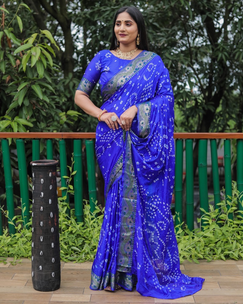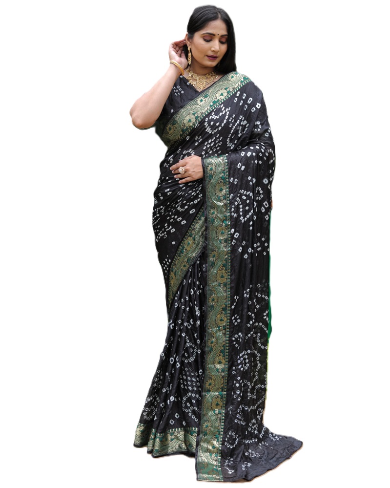 - At FOLKSANA, we take pride in offering high-quality, stylish, and culturally significant clothing. Our Pure Bandhej Silk Saree with Zari Weaving Border is a testament to our commitment to excellence. This saree is perfect for those who appreciate the blend of tradition and modernity in their festive attire.