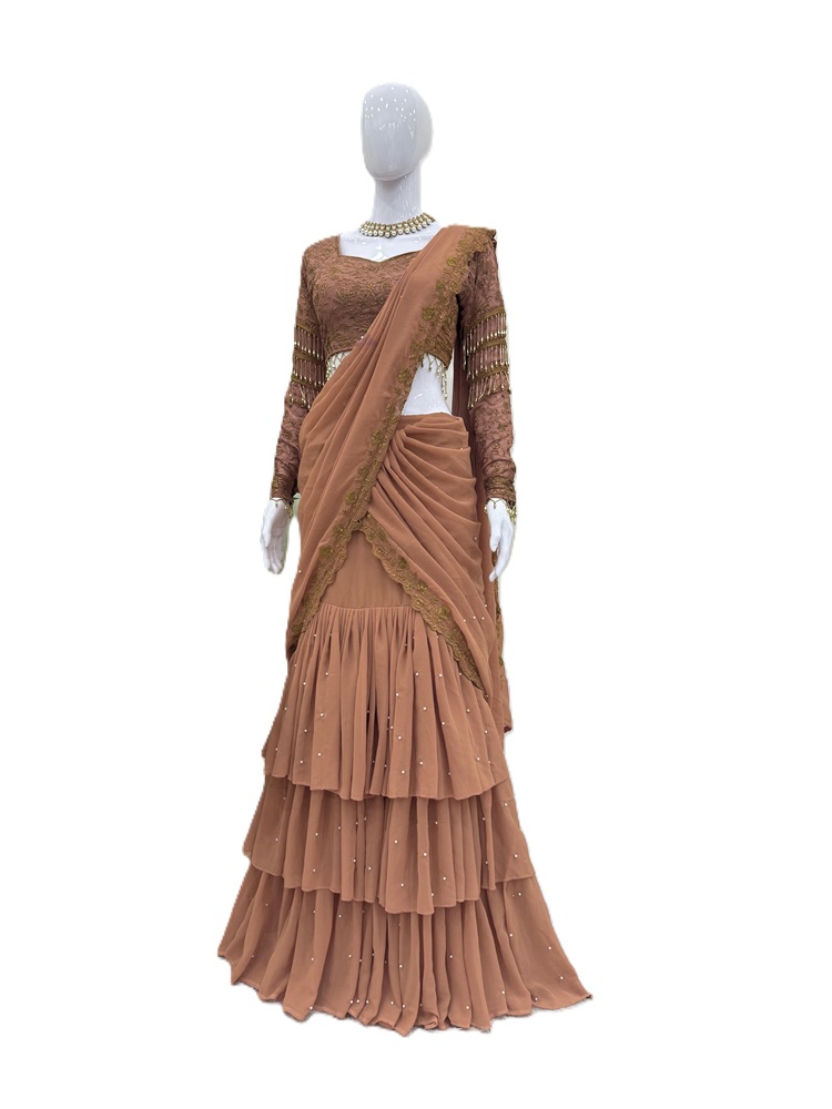 Our ready-to-wear lehenga saree is a modern and convenient fusion of the traditional lehenga choli and saree, designed for effortless elegance and ease of wear. It eliminates the need for intricate draping and pleating, offering a stylish and comfortable alternative for various occasions.