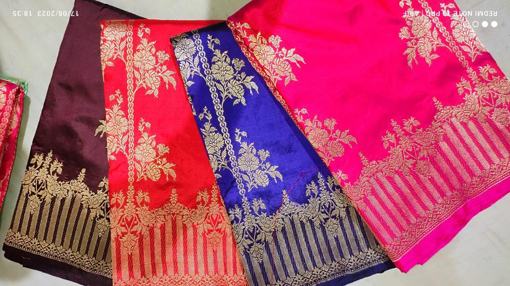 - Handcrafted Opulence: Each saree is a masterpiece of handcrafted opulence. Artisans in Varanasi bring their skill and passion to every inch, creating intricate patterns and designs that tell a story of heritage and artistry.